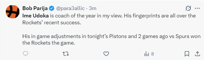 休媒对乌度卡的评价也是截然不同:在我看来乌度卡就是年度最佳主帅,火箭队近期的成就他贡献颇多,火箭击败活塞、马刺的比赛他做了很多战术调整。