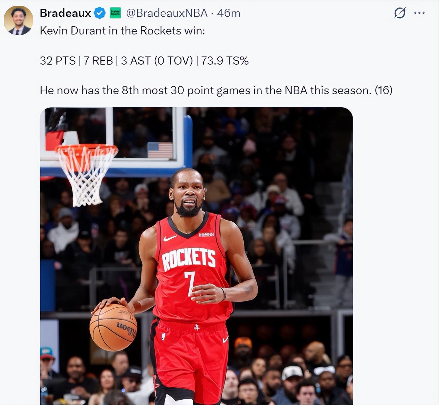 火记也晒出杜兰特的数据,实际上杜兰特才是这支火箭队的基本盘,关键球都给杜兰特处理更好。
